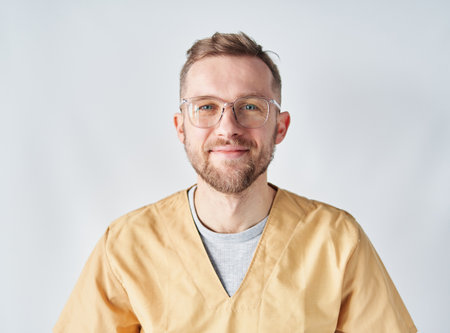 Close up portrait of a male doctor or nurse with his arms raising up eyeglasses. Portrait of a handsome caucasian male doctor wearing eyeglasses and beige medical uniform. High quality photo