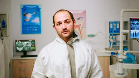 Portrait of exhausted stomatologist man taking off face shield looking at camera sitting in new normal dental office. pediatric nurse talking with child patient in background.