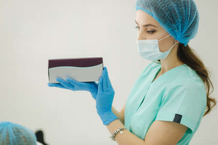 Cosmetologist hold cosmetic product in hand. Attractive medical worker