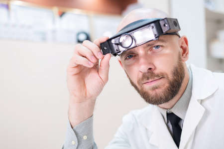 Male bearded doctor in a medical coat and with a magnifying head strap w lights sitting on the desk. Optometrist equipment. Medical office.