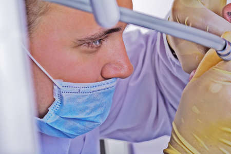 Macro bottom view of a glowing dental microscope and a doctor who is using it. Man wears a blue medical mask. Vertical.