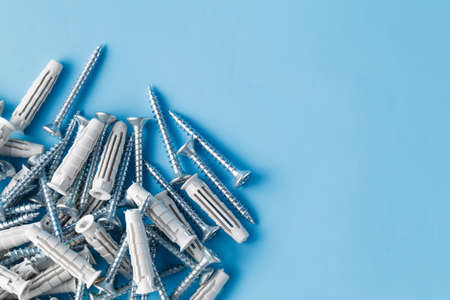 Group of screws on plain blue background with copyspace