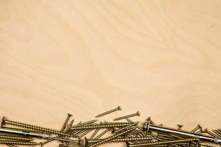 Golden screws on bottom with wood background. Photo of construction background.