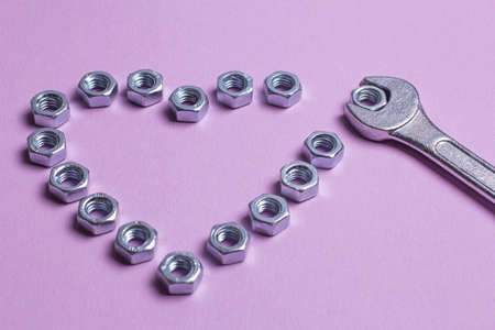 The heart of the nuts with a wrench on a purple paper background. Brutal heart for Valentine's Day