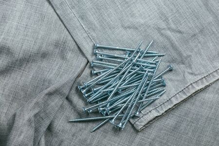 A handful of metallic self-cutters screws lies against the backdrop of an old denim fabric. Selective focus macro shot with shallow DOF.