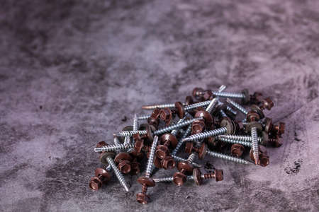Construction fasteners. Self-tapping screws are scattered in a disorderly heap on a dark background. Excellent design for advertising construction fasteners