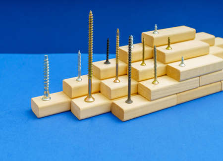 Screws of various shapes, colors and sizes stand on wooden bars on a blue background