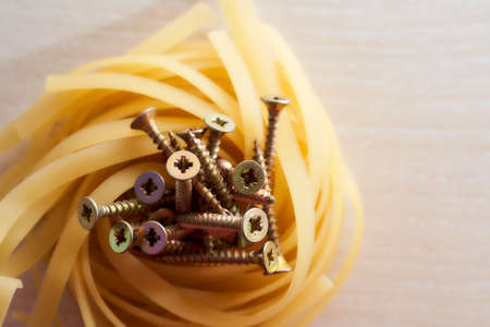 The screws lie in the nest of spaghetti light background