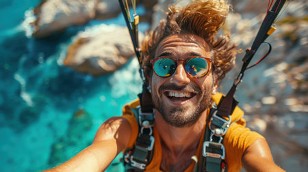 Thrilling aerial adventure man paragliding alone, soaring through the skies on a sunny day