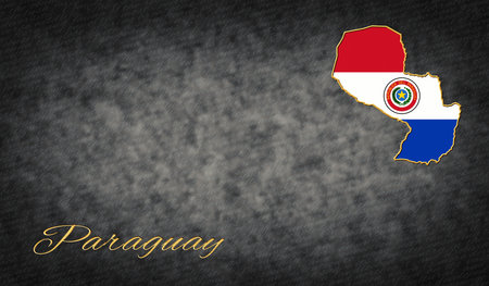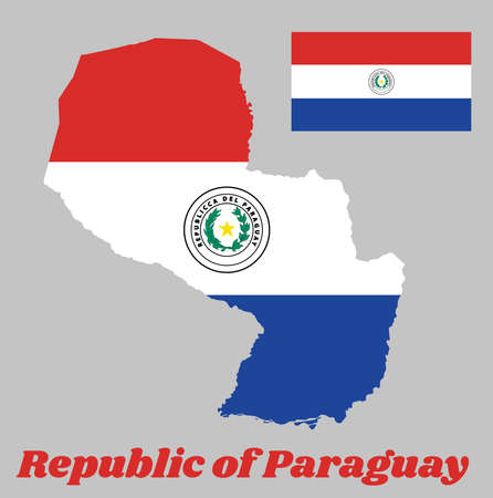 Map outline and flag of Paraguay, a horizontal triband of red, white and blue, with the coat of arms of Paraguay, text name Republic of Paraguay.