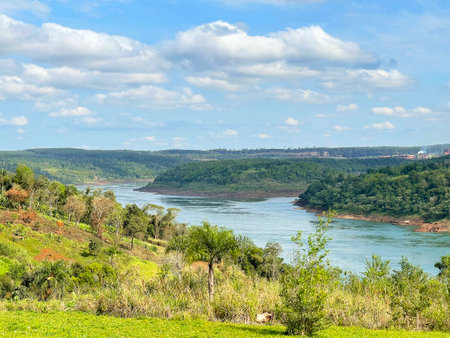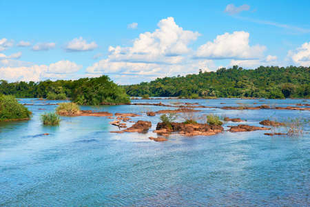 The Iguazu river flowing across the jungle in the frontier between Argentina and Brazil. The fresh water, shallows and green forest under a blue sky.