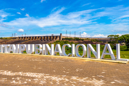 Foz do Iguacu Parana Brazil December 29, 2020 Brazil's largest dam in the world Itaipu energy production on the border with Paraguay entrance building lettering sign signs and art in Brazil.