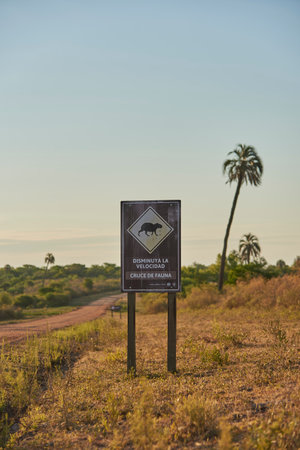 Dec 31, 2021, El Palmar National Park, Entre Rios, Argentina: Dirt road and signage with the drawing of a capybara and the text Slow down. Wildlife crossing. Concepts: eco tourism, nature protection.