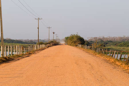 Brazilian dirt road in perspective. Famous Brazilian Transpantaneira dirt road. Pantanal area, Brazil