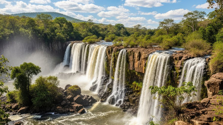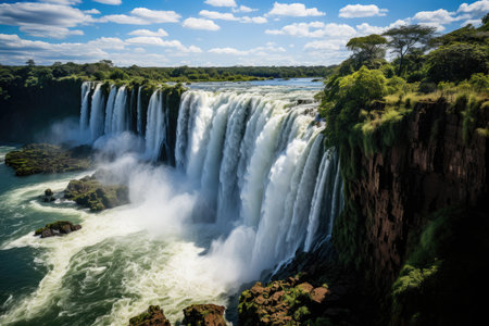 A powerful waterfall plunges into a river, showcasing a vibrant display of water and nature. The composition features numerous cascading streams and lush greenery. The image has rich color and lighting, suggesting a bright day in an outdoor setting. Suitable for commercial and editorial applications, this image evokes the power and beauty of nature.