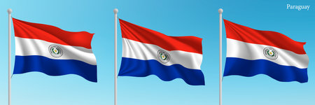 Set of three flags of Paraguay waving on flagpoles with a vibrant blue sky backdrop.