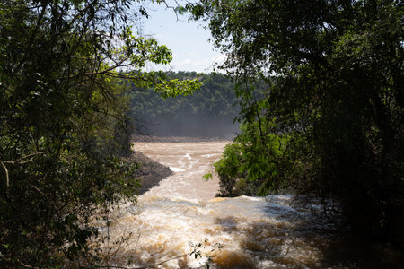 Flood swollen river leading to famous Iguassu Falls on border between Brazil and Argentina