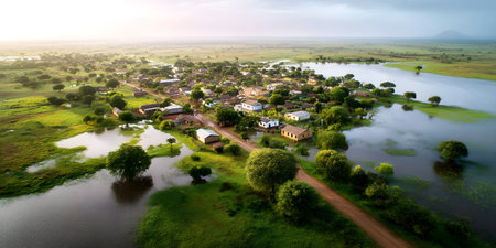 Aerial view of a rural village surrounded by lush greenery and partially flooded fields under soft morning light. High quality photo