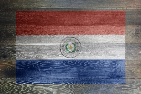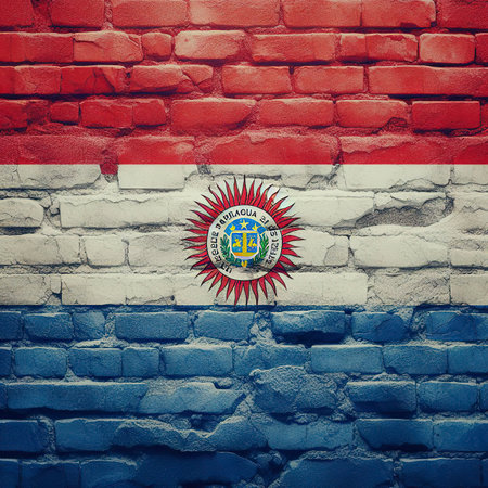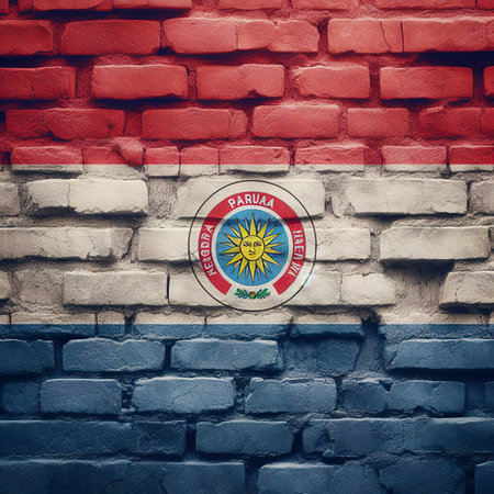 Paraguay flag overlay on old granite brick and cement wall texture for background use