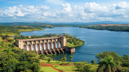 A breathtaking view of a dam surrounded by a serene river and lush greenery under a blue sky, showcasing nature's harmony and engineering marvel.
