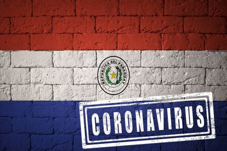 Flag of the Paraguay with original proportions. stamped of Coronavirus. brick wall texture. Corona virus concept. On the verge of a COVID-19 or 2019-nCoV Pandemic.