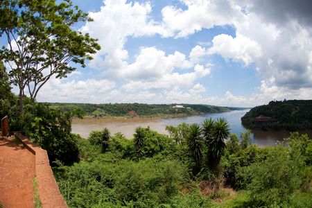 Triple frontier, international border between Paraguay, Brazil and Argentina; geographical point where the Iguazu and Parana rivers converge. View from the Argentine side.