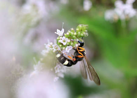 Scolia hirta (Hymenoptera, Scoliidae) sitting on a white flower, sunny day in summer, Vienna (Austria)