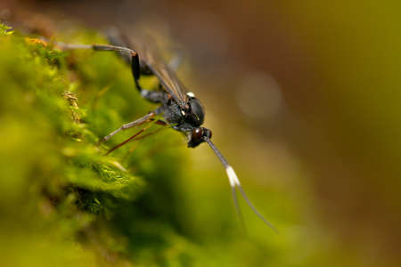 Close up of a Brown legged Black Ichneumon Wasp half body shot crawling down on a dry leaf clear eyes and antennas
