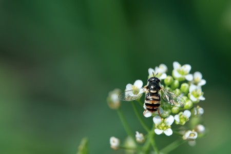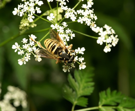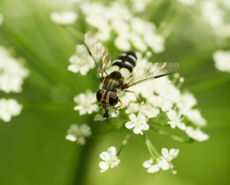 hoverfly on small white flowers close up in summer