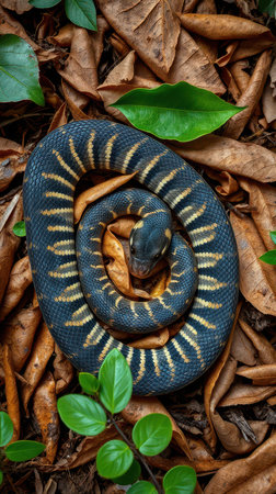Striking black and yellow snake curled in leaves during a sunny afternoon in a lush forest