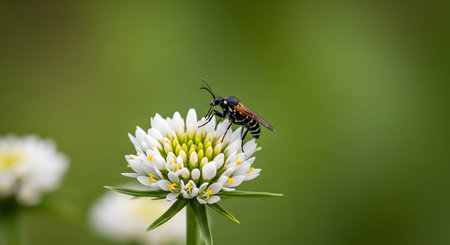 A close-up macro shot of a black and insect, possibly a wasp or bee, perched on a white flower head. The insect is gathering nectar or pollen, set against a smooth, blurred green background, highlighting biodiversity.