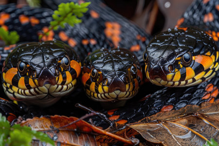 Three Black-Banded Snakes with Orange and Yellow Stripes
