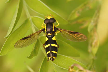 Closeup on a colorfull black and yellow hoverfly, Chrysotoxum bicinctum, sitting with open wings on a leaf in the garden