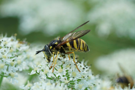 Natural closeup on a female wasp-mimic spearhorn hoverfly, Chrysotoxum fasciolatum on a white Hogweed in the Austrian alps