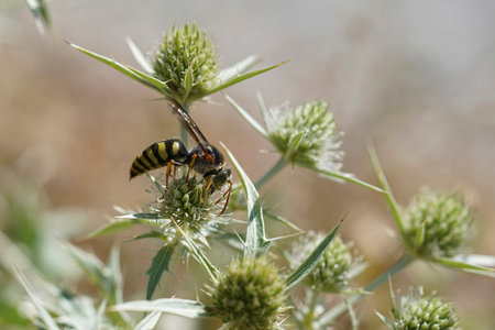 Detailed closeup shot of a Mediterranean Stizus ruficornis wasp on green eryngium campestre plant