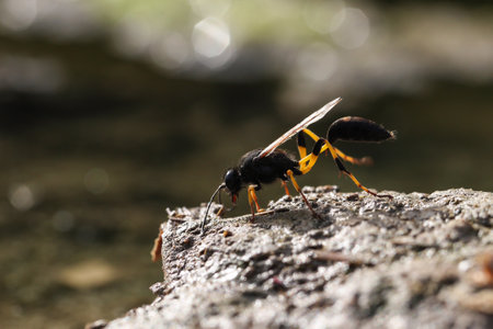 Backlit Mud dauber wasp Sceliphron spirifex landed on mud to pick up mud to build nest. Malta, Mediterranean