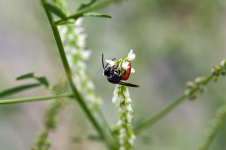 A slurry wasp perched on a wildflower. This insect has the scientific name Sceliphron curvatum.