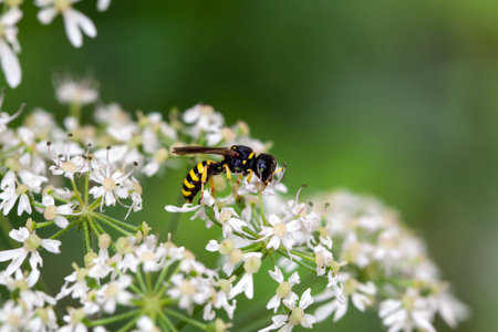 Closeup of a small wasp on wild white flowers
