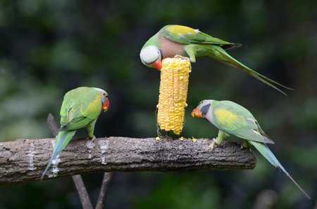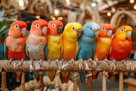 Colorful parakeets perched on a tropical branch, their bright feathers and lively behavior creating a vibrant scene