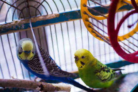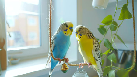 Colorful blue and yellow budgerigars on a perch in a sunlit home. Concept of pet birds, avian companions, domestic animals, indoor aviary.