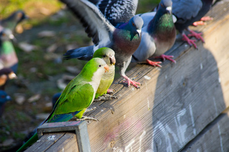 A closeup shot of Monk parakeet parrots sitting on a wooden fence