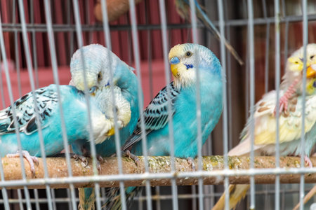 Close-up of blue, green budgie birds sitting on a rope in an aviary