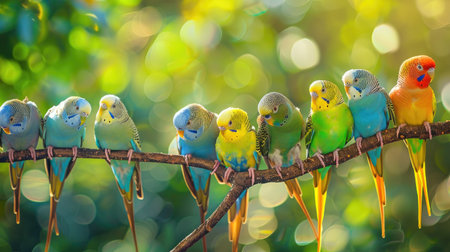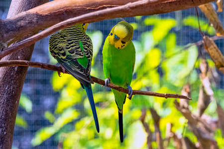 Budgerigars sitting on a branch. Brightly colorful parrots.