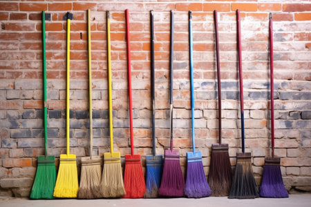 color-coded brooms leaning against a factory wall, created with generative ai