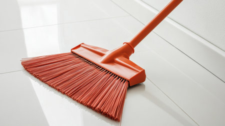 A close-up view of an orange broom resting on a glossy tile floor, showcasing its bristles and handle. Perfect for home and office cleaning scenarios.