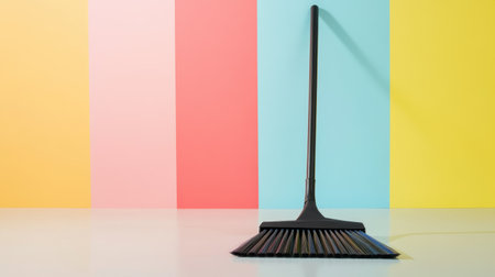 A sleek black broom stands against a vibrant backdrop of colored stripes, symbolizing modern cleaning tools and home decor. Perfect for lifestyle themes.