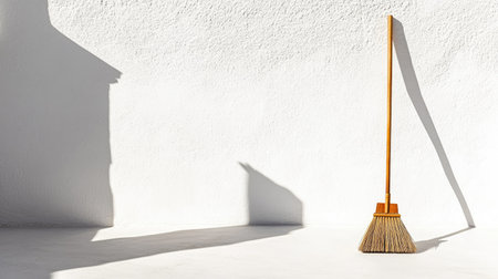 A minimalist broom stands against a softly colored wall, bathed in bright sunlight and casting long shadows, symbolizing cleanliness and careful design.