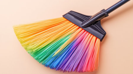 This image features a vibrant broom with rainbow-colored bristles, ideal for inspiring creativity in cleaning. The bright design adds a splash of color to any indoor space.