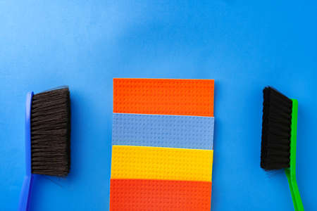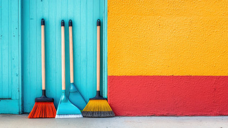 A visually striking arrangement of colorful cleaning tools against a textured wall. This image captures the essence of home cleanliness with vibrant hues and simple design.
