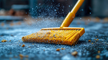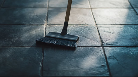 A close-up view of a broom sweeping a dark stone floor. The image highlights the importance of cleanliness and maintenance in a home or workspace setting.